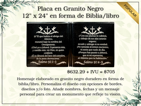 Lápida Grabada en Granito 12"x24" (forma de Biblia)