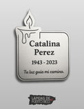 Esta placa conmemorativa con diseño de vela representa la guía, la fe y la presencia eterna de quienes iluminan nuestro camino incluso después de partir.